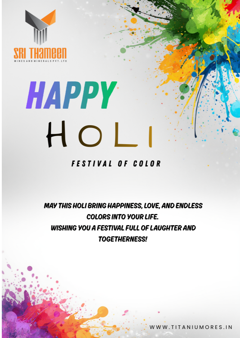Happy Holi from SRI THAMEEN MINES AND MINERALS PVT LTD. As we celebrate the festival of colors, we continue our commitment to delivering strength, quality, and reliability in every grain of mineral we supply. Wishing our partners and clients a vibrant year filled with growth and success. #HappyHoli #SriThameenMines #HeavyMinerals #IndustrialExcellence #GlobalPartnerships
