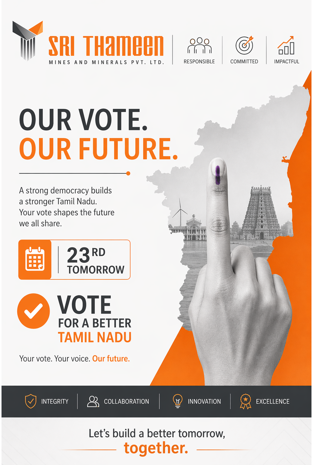 Tomorrow, 23rd, is an important day for Tamil Nadu. At Sri Thameen Mines and Minerals Pvt. Ltd., we believe that responsible businesses also stand for responsible citizenship. Voting is not just a right—it’s a duty that shapes the future of our state and our nation. A strong democracy is built by active participation. Every vote matters. Every voice counts. Let’s step forward, exercise our right, and contribute to a better, stronger Tamil Nadu. 🗳️ Make your vote count.